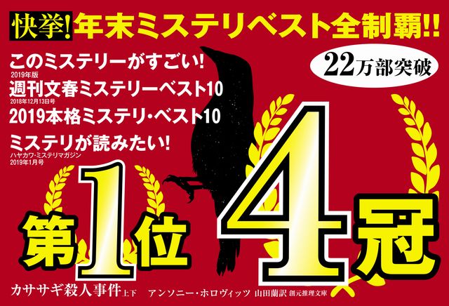 2018年9月の刊行以来ご高評をいただいていました『カササギ殺人事件』が、上記の年末ミステリランキングすべてで1位に選出されました。ご投票くださった方々、お読み下さった方々に、厚く御礼を申し上げます。